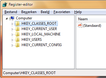 In het linkerdeelvenster van de Register-editor, die enigszins op Verkenner lijkt, ziet u een vijftal mappen. In het register worden deze mappen sleutels genoemd, en in dit geval gaat het om de vijf hoofdsleutels (Engels: root keys) van het register.