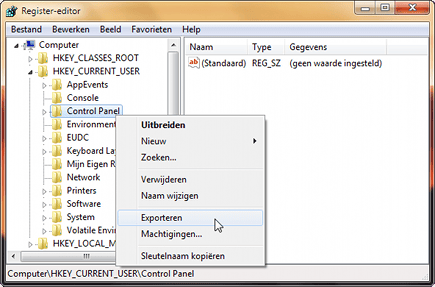 Wanneer u registerwaarden in een bepaalde sleutel wilt wijzigen, is het raadzaam deze sleutel eerst te exporteren. Op deze manier maakt u een back-up van de betreffende sleutel. Gaat er onverhoopt iets mis, dan kunt u dit eenvoudig herstellen door deze sleutel weer te importeren. U exporteert een sleutel door hem in het linkerdeelvenster van de Register-editor te selecteren. Via een rechtermuisklik of via het menu Bestand kiest u vervolgens Exporteren, en tenslotte slaat u het bestand op - bijvoorbeeld als backup.reg.