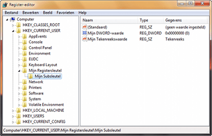 Voert u het eerste registerbestand uit met de Register-editor geopend, dan zult u in het linkerdeelvenster onder de root key HKEY_CURRENT_USER direct een nieuwe sleutel met de naam Mijn Registersleutel zien verschijnen. Hierin bevindt zich een subsleutel, waarin zich weer twee registerwaarden bevinden.