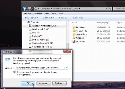 U gebruikt hiervoor de commando's reg save en reg restore. Om bijvoorbeeld een back-up van de gehele root key HKEY_CURRENT_USER te maken, geeft u via Start / Uitvoeren of via een opdrachtprompt het commando reg save HKEY_CURRENT_USER C:\backup.hiv. Wilt u HKEY_CURRENT_USER weer in de originele staat herstellen, dan zet u het bestand backup.hiv terug met de opdracht reg restore HKEY_CURRENT_USER C:\backup.hiv. Wanneer het pad naar de betreffende sleutel langer is, en zeker als er zich spaties in dat pad bevinden, dient u het in zijn geheel tussen aanhalingstekens te zetten.