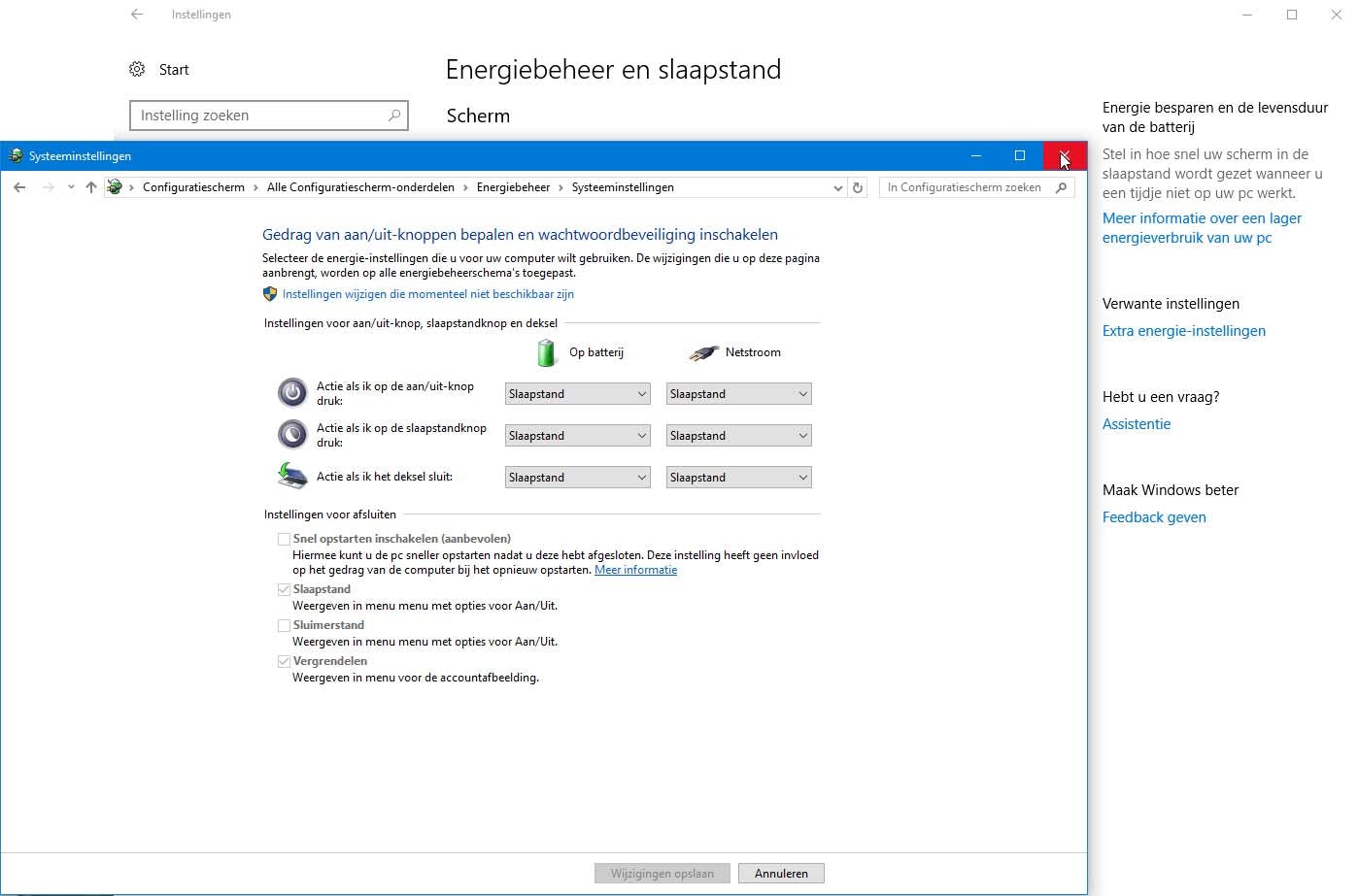Niet alleen is het erg ongezond om zo'n nagenoeg ongemerkt niet echt uitgeschakelde laptop in je tas te stoppen; het gevaar op oververhitting en daardoor beschadigde onderdelen is immers groot vanwege het gebrek aan ventilatie. In een extreem scenario zou er zelfs brand kunnen ontstaan. Je moet er niet aan denken als zoiets in het bagagerek van een vliegtuig hoog in de lucht gebeurt. Kortom: zet voor je eigen gemoedsrust dat snelle opstarten maar uit. Dat gaat zo. Klik in het menu Start op Instellingen. Klik in het geopende venster op Systeem en dan links op Energiebeheer en slaapstand. Klik vervolgens rechts op Extra energie-instellingen. In weer een nieuw venster klik je op Het gedrag van de aan/uit-knoppen bepalen. Inderdaad volkomen onlogisch en het is dan ook vreemd dat Microsoft zo'n belangrijke functie op zo'n rare plek heeft verstopt, en ook nog eens standaard aan heeft staan.