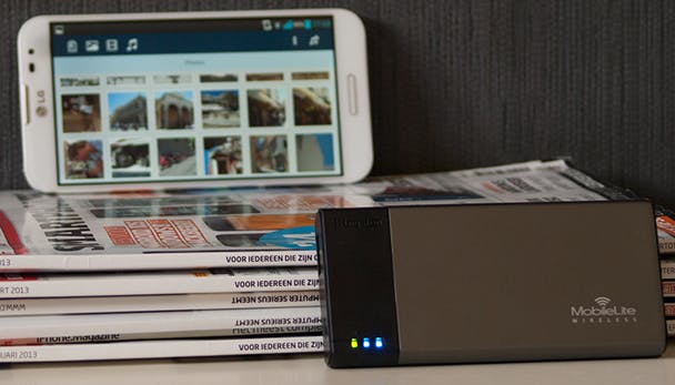 Door de aan-knop drie seconden ingedrukt te houden wordt het wifi-signaal geactiveerd. Met je telefoon kan je dan verbinding maken met dit signaal en je hebt toegang tot de bestanden die op de MobileLite staan.