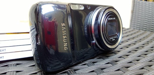 Het uiterlijk is dan ook erg wennen. Vooral de eerste dagen voelt het niet bepaald praktisch om een compactcamera tegen je oor te houden als je wilt bellen. Daarnaast is het ook een erg groot blok om in je broekzak te stoppen, wat erin resulteerde dat ik het toestel meestal maar in m’n rugzak gooide als ik de deur uitging. De behuizing is, geheel in Samsung-traditie, compleet van plastic. Dit geeft het toestel een wat goedkoop uiterlijk en het glimmende materiaal is ook nog eens extreem gevoelig voor vingerafdrukken. Bah.