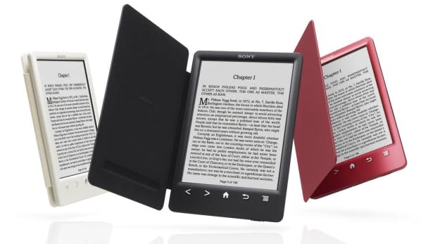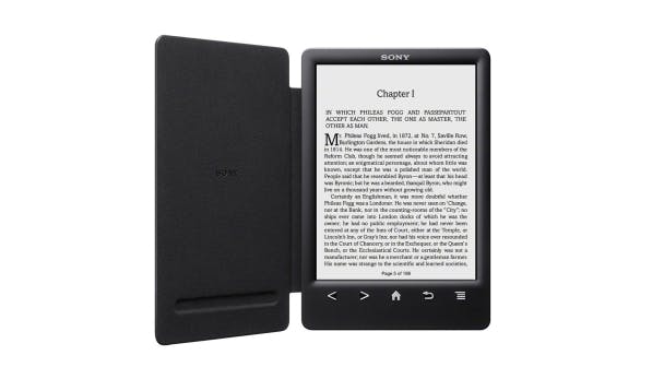 De e-reader van Sony springt eruit door zijn cover en navigatieknoppen.