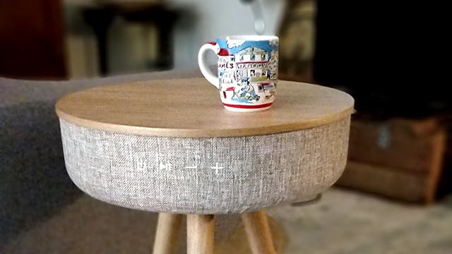 Een stijlvolle bijzettafel met een ingebouwde speaker hoort daar niet direct bij. De AirTable kent drie poten, daarboven zit een vrij grote, ronde speaker die tevens dienstdoet als houten tafelblad. Hij weegt iets minder dan zes kilo en is met afmetingen van 41 x 41 x 64,5 cm best flink te noemen. Daarmee schept hij dus wat verwachtingen: van zo’n relatief groot apparaat mag je aannemen dat ‘ie meer dan voldoende ruimte heeft om tot goed geluid te komen, maar dat is helaas niet het geval. Het model kent vier 12 watt speakers en 2 stuks 20 watt tweeters, maar die komen samen nou niet echt tot een fijn dynamisch geluid. Het klinkt allemaal schel, blikkerig en vooral: goedkoop. Wel kan het apparaat hard. Heel hard. Moet je alleen wel het enorm schelle resultaat op de koop toe nemen. Voor audiopuristen is dit kunststuk een weinig geschikt, dus.