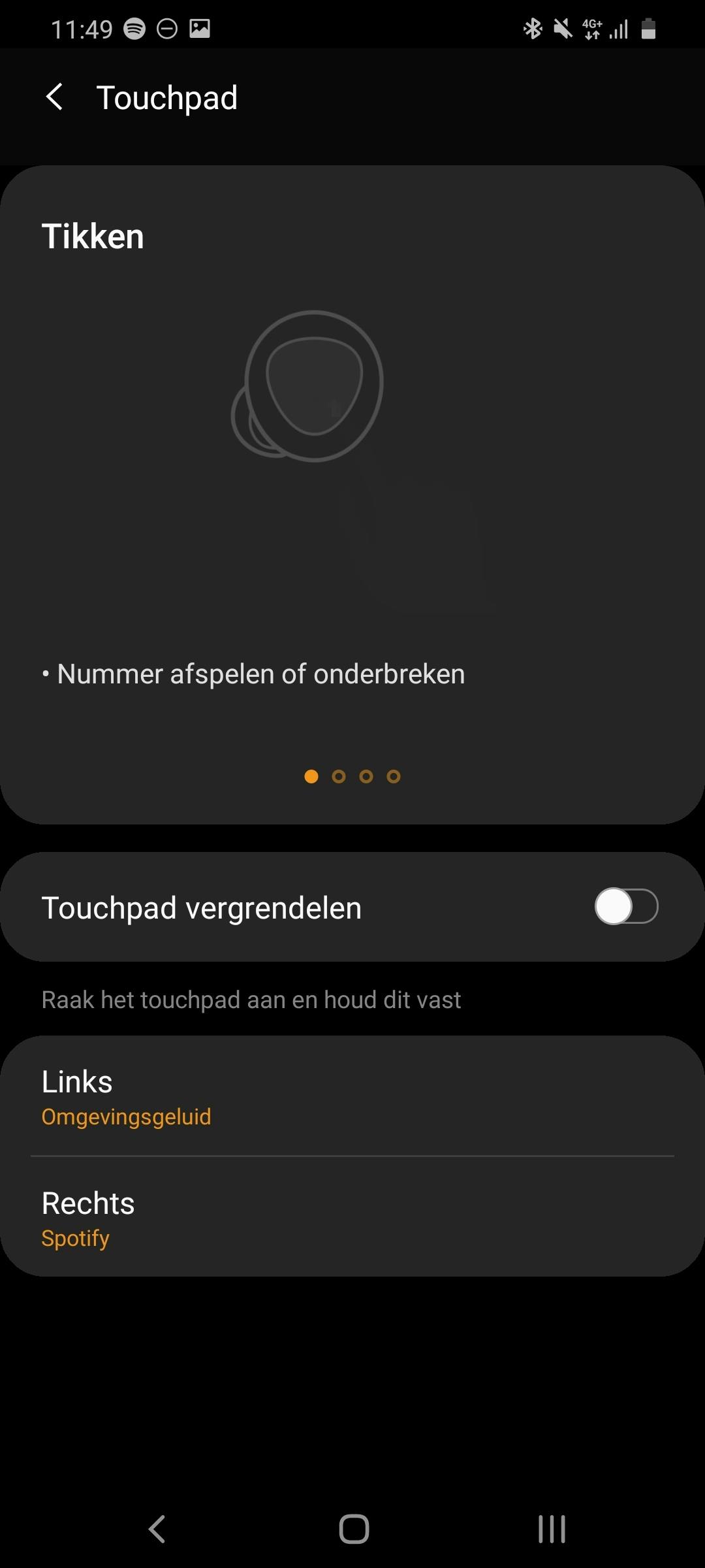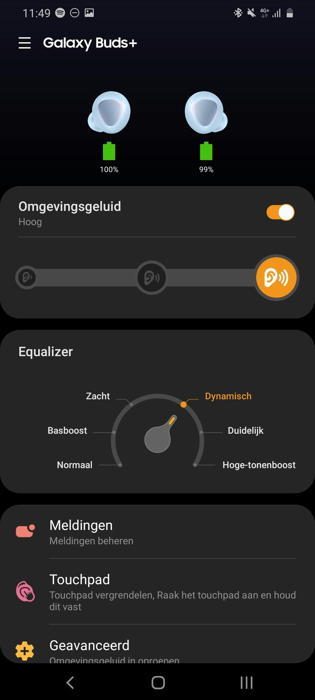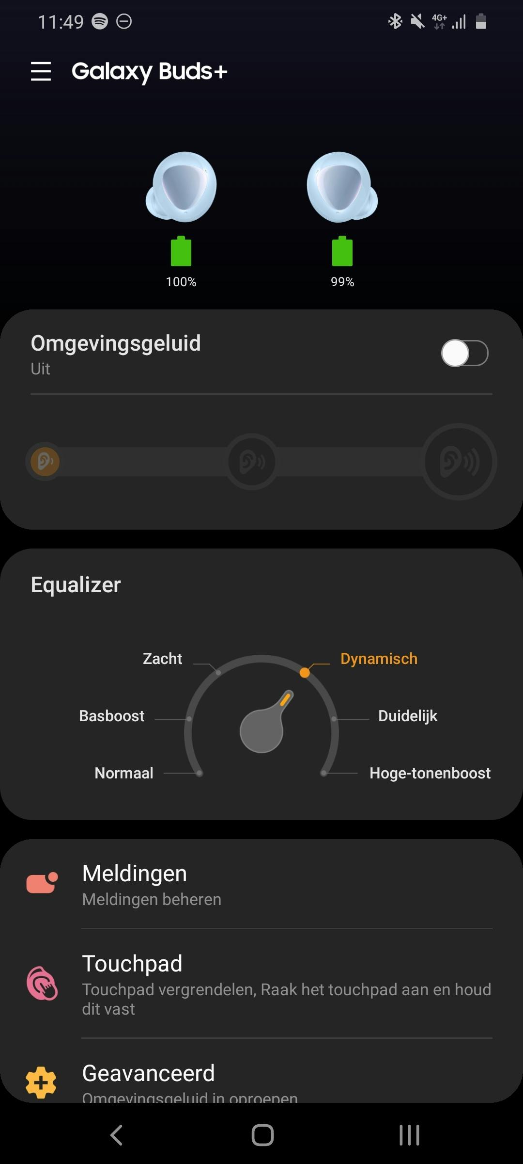 Samsungs gratis Galaxy Wearable-app (Android) of Galaxy Buds Plus-app (iOS) geeft je meer controle over de werking van de oordopjes. Na het verbinden kun je in deze app onder meer aangeven wat de Buds+ doen bij een enkele, dubbele, driedubbele of lange tik op de aanraakgevoelige oorschelpen. De app bevat ook een equalizer, instellingen voor notificaties voor je oordopjes en drie standen voor omgevingsgeluid. Die functie staat standaard uit. Eenmaal ingeschakeld in de app kun je de feature toewijzen aan een oorschelp. Als je omgevingsgeluid activeert, hoor je de geluiden om je heen versterkt en over je muziek heen. Handig als je op de fiets zit en naast je muziek ook het verkeer wil horen, om maar een voorbeeld te noemen. De omgevingsgeluid-modus klinkt realistischer dan op de vorige Buds, maar kan nog steeds wennen zijn. Het loont om te spelen met de drie standen.