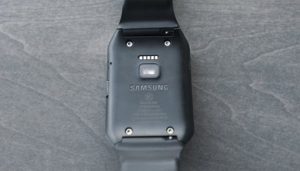 Het heldere kleurenscherm van de Gear Live is afgewerkt met een aluminium frame en het polsbandje is uit plastic vervaardigd. Dat bandje kun je trouwens eenvoudig vervangen door een ander exemplaar van 22 mm breed. Er zit één knopje aan de zijkant, voor de rest bedien je het toestel door te tikken en swipen op het scherm. Een back-knop ontbreekt en dat is wel jammer. De camera? Die is er niet meer, maar dat is geen groot gemis.