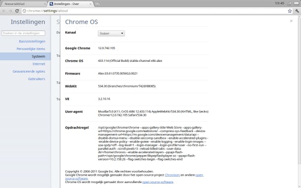 Hoewel Chrome OS erg gelimiteerd lijkt, zijn er wel een paar dingen mogelijk om wat meer instellingen beschikbaar te krijgen. Door in het adresveld about:flags te tikken komt u op een pagina waar u opties kunt inschakelen die nog in ontwikkeling zijn. Verder is het mogelijk om een ander updatekanaal te kiezen voor Chrome OS via de menuknop (het sleuteltje) / Over Chrome OS / Meer Informatie. Chrome OS heeft drie verschillende kanalen: Stabiel, Bèta en Dev - Instabiel. Pas daar wel mee op. Nadat wij de Chromebook hadden ingesteld op Dev - Instabiel merkten we na de update niet echt veel verschil (alleen het spel Angry Birds werkte niet). Het bleek niet mogelijk om de Chromebook simpelweg weer te abonneren op het kanaal Stabiel, want het is niet mogelijk te 'updaten' naar een lager versienummer. We moesten daarom met een Windows-pc via www.google.com/chromeos/recovery een image downloaden en de notebook met behulp van een usb-stick herstellen. Om de Samsung Series 5 Chromebook vanaf de usb-stick te herstellen, moet u met een paperclip een schakelaartje omzetten dat u aan de rechterkant onder het klepje vindt. Hetzelfde schakelaartje kunt u gebruiken om de Chromebook in de developermodus te zetten, waarmee u een diepere toegang krijgt. Hoewel de verschillende kanalen en de developermodus voor de geïnteresseerde gebruiker interessant zijn, is het wel erg eenvoudig om het apparaat te abonneren op de kanalen Bèta of Dev - Instabiel, waardoor het voor de doorsnee gebruiker erg eenvoudig wordt om functionaliteiten stuk te maken.