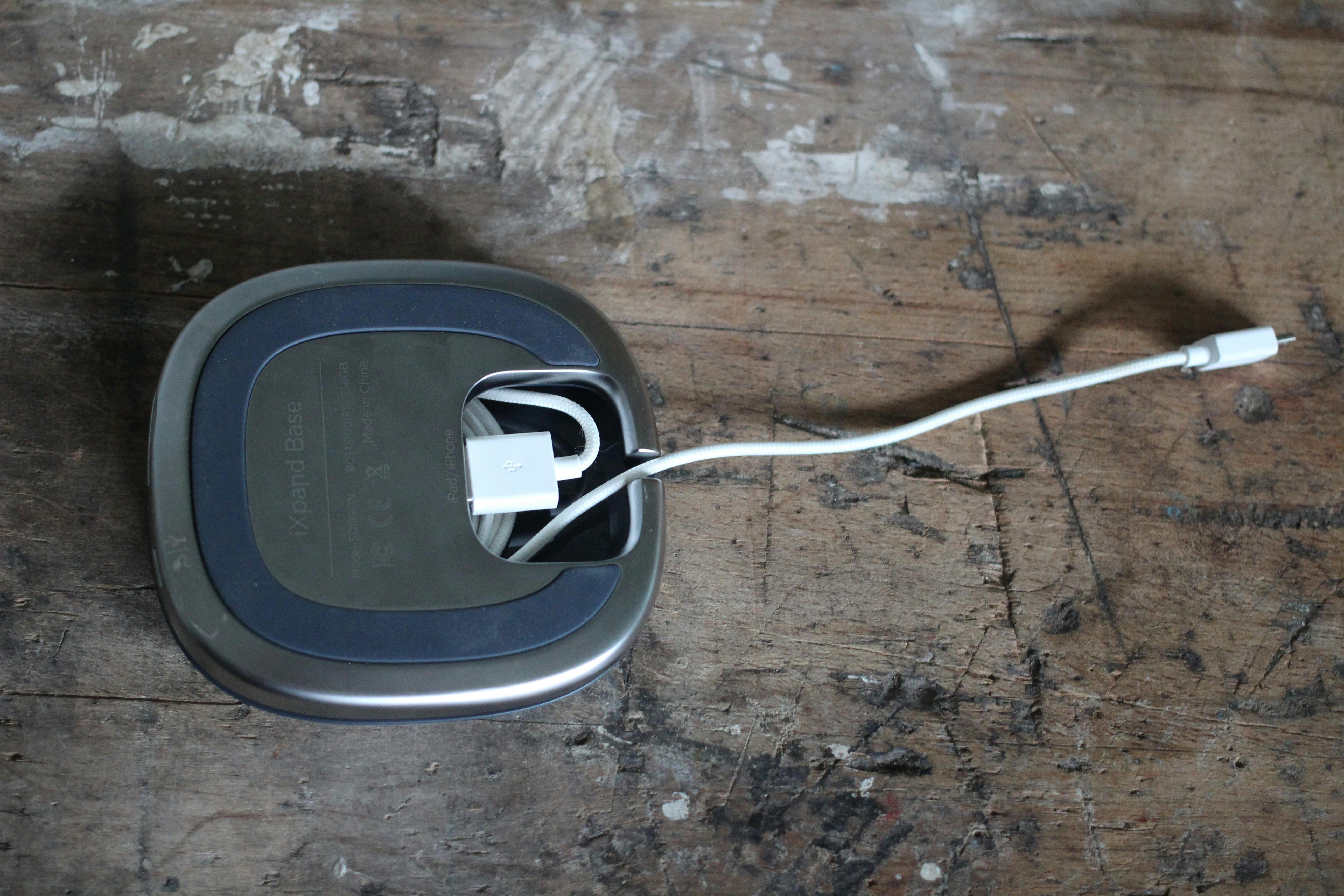 Het is mogelijk om de draad weg te werken langs de rand van de iXpand Base. Doordat je de iPhone plat neerlegt, moet je echter wel wat speling overhouden in het snoer. Het snoer voor je iPhone moet je overigens zelf regelen – die krijg je er niet bij. Wel krijg je een adapter om de iXpand Base van stroom te voorzien via microUSB.