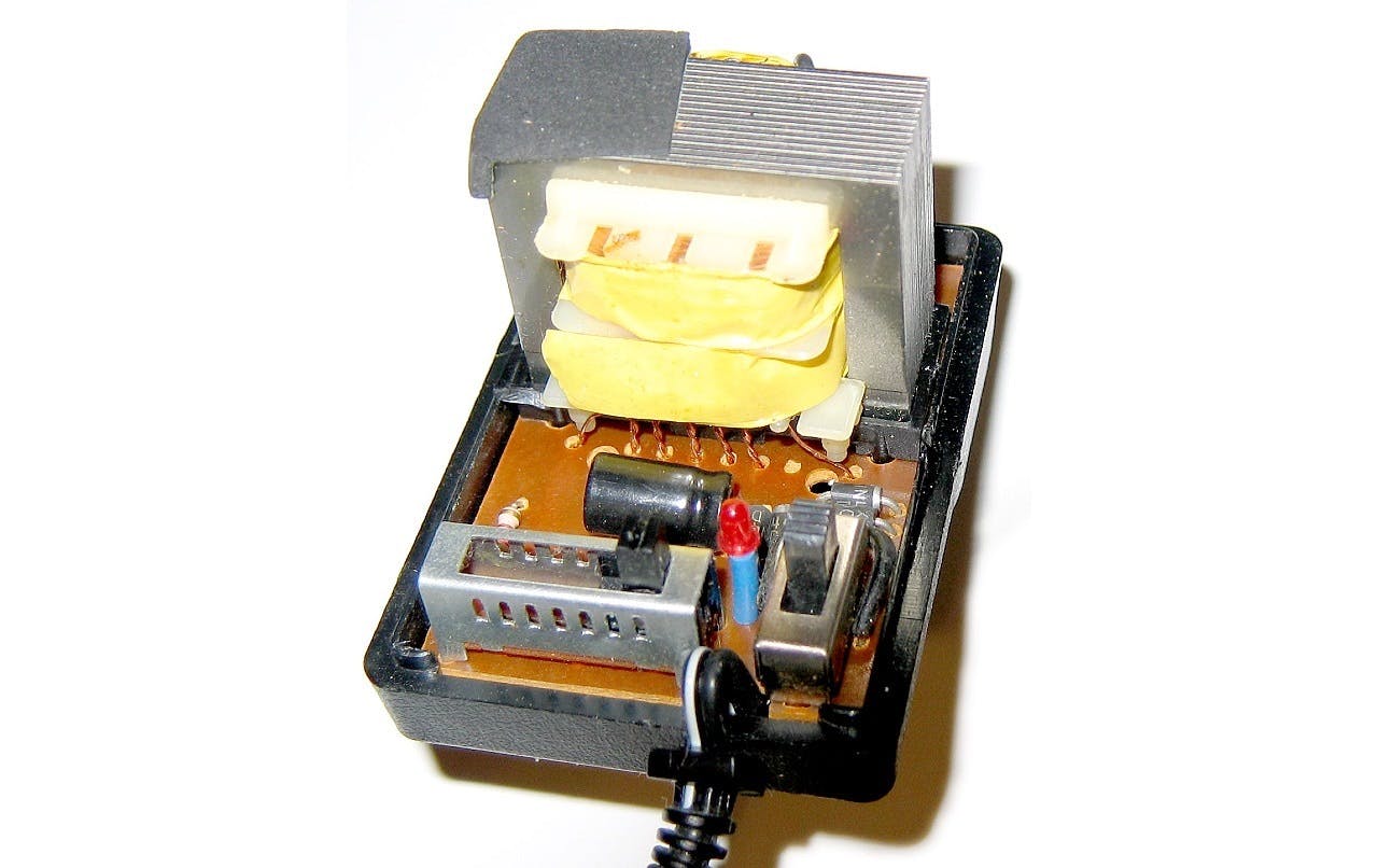 Eerst een stukje theorie wat netvoedingen betreft. Standaard werkt het overgrote deel van de kleine elektronica in huis niet op de 230 Volt netspanning; een wisselspanning met een frequentie van 50 Hz. Het gaat altijd om (veel) lagere gelijkspanningen. Vanaf een paar Volt zelfs. Om van die netspanning een veilige laagspanning te maken is in ieder geval een transformator nodig. Niet alleen brengt deze de spanning omlaag, maar zorgt ook voor een galvanische (ofwel elektrische) scheiding tussen de levensgevaarlijke netspanning en de gewenste laagspanning. Een transformator bestaat in z’n eenvoudigste vorm uit twee spoelen waarin een ijzerpakket is gebouwd. Aan de primaire kant wordt de netspanning aangesloten. Doordat deze spoel een magneetveld opwekt, werkt de andere – secundaire - spoel als een soort van dynamo. Ofwel: deze wekt spanning op. De hoogte van de spanning is afhankelijk van de verhouding tussen de wikkelingen van de primaire en secundaire spoel. Stel je hebt een primaire spoel met 3000 wikkelingen en een secundaire met 300. Dan is de verhouding 3000 : 300, ofwel de spanning wordt met een factor 10 verlaagd: 230 / 10 = 23 Volt. Met een beetje simpel rekenwerk kun je zo allerlei spanningen realiseren. Overigens: omhoog transformeren kan óók, maar zie je tegenwoordig niet heel veel meer in apparatuur voor thuis. Vroeger, in de tijd van de buizenradio en beeldbuis-tv was dat omhoog transformeren veel meer gemeengoed.