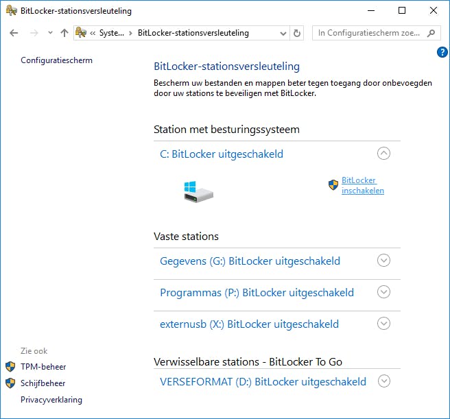 Klaagt BitLocker over het ontbreken van tpm – druk eventueel op Windows-toets+R en voer tpm.msc uit. Zo’n tpm-chip is veiliger omdat het een deel van de encryptiesleutel voor zichzelf houdt in plaats van die op de schijf te bewaren. We gaan er alvast van uit dat je BitLocker hebt weten te activeren.