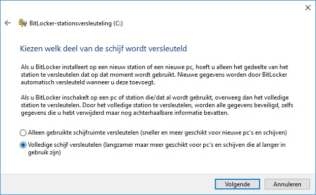 In het volgende venster krijg je alweer een andere vraag: wil je alleen de gebruikte schijfruimte of de volledige schijf versleutelen? Het mag duidelijk zijn dat deze laatste optie langer zal duren, maar dan worden ook oude, “verwijderde” data van encryptie voorzien. In het volgende venster kies je voor Nieuwe versleutelingsmodus (tenzij je de schijf nog op een oudere Windows-versie wilt gebruiken) en beantwoord je de vraag of je een BitLocker-systeemcontrole wilt laten uitvoeren. Hierna kan de versleuteling van start gaan. Dit proces kun je overigens altijd onderbreken en later weer voortzetten.