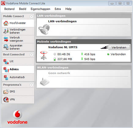 De mobiele router geeft geen inzicht in het verbruikte dataverkeer, kies dus altijd voor een 3G-abonnement zonder datalimiet! (screenshot: Vodafone Mobile Connect-software).