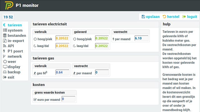 Voordat je met P1 monitor aan de slag gaat, is het handig om de instellingen na te lopen via Instellingen. Het is bijvoorbeeld handig om je gebruiksgegevens te vertalen naar kosten. Onder Tarieven kun je aangeven wat jouw tarieven voor elektriciteit en gas zijn. Ook kun je een grenswaarde instellen. Dat is het streefbedrag voor je kosten per maand. In het overzicht met kosten zie je dit als grenslijn terug, zodat je direct ziet of je over of onder het gewenste maandbedrag blijft.