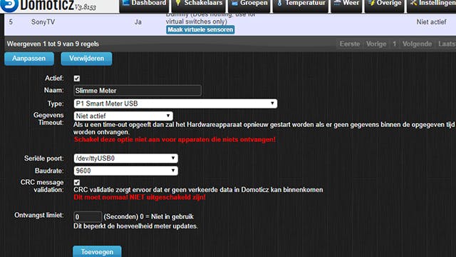 Ondersteuning voor deze kabel en de slimme meter is al ingebouwd in Domoticz. Ga hiervoor naar Instellingen / Hardware en voeg het apparaat genaamd P1 Smart Meter USB toe. Daarna kies je in de lijst bij Seriële poort de usb-poort waarop je het kabeltje hebt aangesloten. Je kunt dit achterhalen via de shell, maar ook gewoon uitproberen. Stel ook de andere details in, zoals de baudrate die afhankelijk van je meter 9600 of 115200 bit per seconde kan zijn.