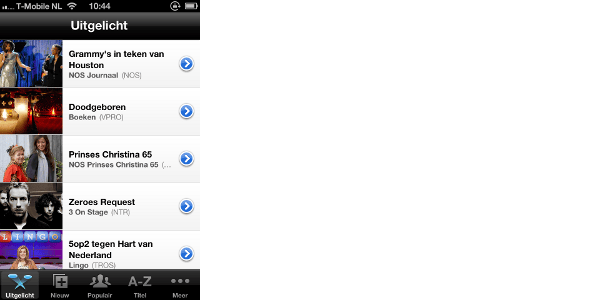 Uitzending Gemist is uitgegroeid tot een website die iedereen eigenlijk weleens heeft bezocht. Er staan altijd interessante programma's op, de dienst is gratis en het is niet eens nodig om in te loggen of u te registreren. Sommige mensen kijken zelden of nooit televisie, maar weten wel hun favoriete afleveringen op deze dienst van de publieke omroep te vinden. Door het succes van de website is al snel een iPhone-app ontwikkeld die min of meer dezelfde mogelijkheden biedt, en inmiddels is er ook een versie voor Android-telefoons. BlackBerry en Windows Phone vallen als platform momenteel buiten de boot. Houd er rekening mee dat er heel wat dataverkeer nodig is om een aflevering te kijken. Mede daarom is het aan te raden om Uitzending Gemist via een wifi-verbinding te gebruiken. Als u op reis bent en een uitzending wilt bekijken via een 3G-verbinding, zult u bovendien merken dat de verbinding vaak zo zwak is dat er haperingen optreden. Tot voor kort konden smartphonegebrukers ook terecht op de website Uitzendinggemist.nl als ze uitzendingen wilden streamen. Op het moment van schrijven waren hier echter geen video's beschikbaar en werd een geheel nieuwe website ontwikkeld. Deze zal geschikt zijn voor mobiele browsers en zal volgens de makers een goed alternatief voor de app gaan bieden.
