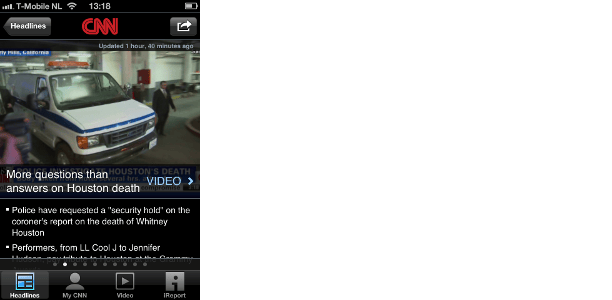 Wie graag op de hoogte blijft van het nieuws in de wereld, kan zich geen betere app wensen dan die van CNN International. Momenteel is de app beschikbaar voor de iPhone, Android-toestellen en de BlackBerry. Ook de app voor Windows Phone-telefoons is inmiddels ontwikkeld en verkrijgbaar voor gebruikers van dit besturingssysteem. De overzichtelijke app rangschikt de nieuwsberichten onder het tabblad Headlines. U ziet daar de belangrijkste berichten bij Top Stories. Als u op een kop tikt, kunt u het artikel lezen en de bijbehorende videobeelden bekijken. Als u op het tabblad Video tikt, krijgt u een overzicht voorgeschoteld van alle filmpjes. Helaas kunt u de filmpjes niet delen met vrienden, dit in tegenstelling tot de nieuwsberichten.