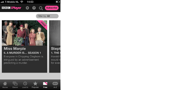 De BBC is een van die weinige omroepen die een soort ongeschreven kwaliteitskeurmerk hebben. Liefhebbers van kwalitatieve series en documentaires zetten de zender graag op. Inmiddels is de BBC ook op de iPhone vertegenwoordigd, met BBC iPlayer. Wie zich een betaald abonnement van 7 euro per maand kan veroorloven, kijkt onbeperkt naar de beste content van de zender. Voor een jaarabonnement moet u 65 euro neerleggen. Dat is nogal een fors prijskaartje en dus alleen weggelegd voor de echte liefhebbers. U krijgt er echter wel toegang mee tot content van de afgelopen 80 jaar. Ook nieuwe programma's zoals Top Gear zijn ermee te bekijken. Erg handig is dat u de app ook kunt gebruiken als u zich niet inschrijft en dus niet betaalt. Onder het tabblad Free zijn namelijk heel wat afleveringen van televisieprogramma's gratis te bekijken. Vaak gaat het daarbij om de eerste afleveringen van een serie.