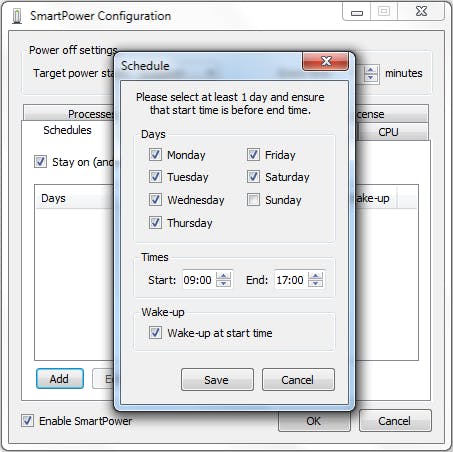 U bepaalt zelf bij welke gebeurtenissen SmartPower de ingestelde actie uitvoert. De gemakkelijkste manier is door een tijdschema in te stellen. U geeft in dat geval aan op welke dagen en tijdstippen u de computer in gebruik neemt. Het is ook mogelijk om de actie af te stemmen op de beschikbaarheid van andere apparaten in het thuisnetwerk. De computer schakelt zichzelf dan uit als er een netwerkapparaat offline is. SmartPower controleert de beschikbaarheid door dit netwerkapparaat te pingen. Dat is bijvoorbeeld handig als u een mediastreamer in de woonkamer gebruikt die films vanaf een oude computer op zolder afspeelt. Zodra u de mediastreamer uitzet, schakelt deze computer zichzelf ook uit. In SmartPower vermeldt u het juiste IP-adres van één of meerdere netwerkapparaten. Verder kunt u ook op basis van netwerkverkeer, cpu-gebruik en Windows-processen het systeem in de slaapstand zetten of afsluiten. Het programma werkt prima, al duurt SmartPower Configuration er soms wel lang over om op te starten.