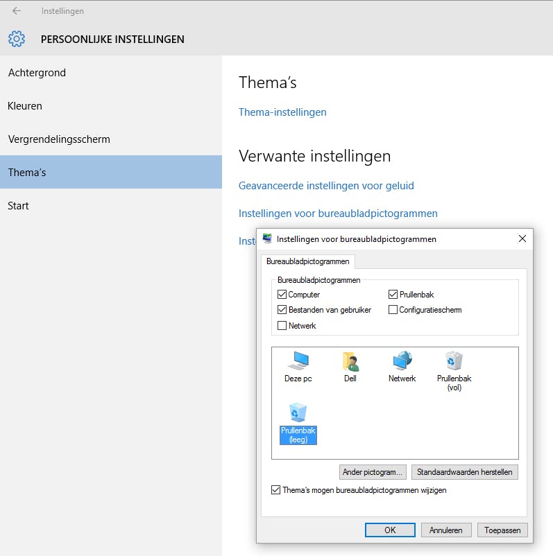 De Prullenbak van Windows is een plek waar bestanden die je van je computer wist komen te staan voordat ze daadwerkelijk verwijderd worden. Dit is handig omdat je op die manier bestanden die je per ongeluk verwijderd hebt gewoon zonder gedoe kunt herstellen. Zie jij op de bureaublad geen Prullenbak-icoontje? Rechtsklik dan op je bureaublad en kies Aan persoonlijke voorkeur aanpassen. In Windows 7 klik je nu links in beeld op Bureaubladpictogrammen wijzigen, in Windows 10 klik je links in beeld op Thema’s en kies je daar Instellingen voor bureaubladpictogrammen. Zet in het pop-upvenster een vinkje voor Prullenbak en klik op OK. Lees ook: In 3 stappen overbodige bestanden verwijderen in Windows 10.