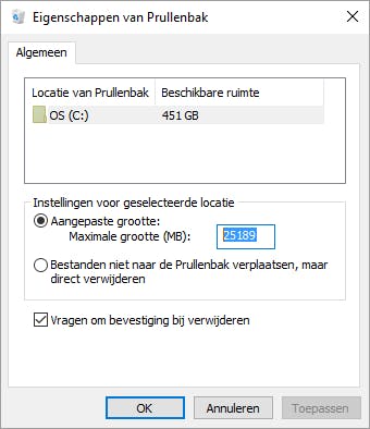 Bestanden die te groot zijn voor de Prullenbak worden wel direct verwijderd. Als je dit niet wilt, of als je juist graag wilt dat de Prullenbak minder opslagruimte in beslag neemt door alleen kleinere bestanden te accepteren, kun je het formaat van de Prullenbak aanpassen in de instellingen. Klik met de rechtermuisknop op de Prullenbak en kies Eigenschappen. Hier kun je voor elke harde schijf in je computer kiezen hoeveel ruimte de Prullenbak in totaal in beslag mag nemen. Wijs je meer ruimte toe, dan kunnen er ofwel grotere individuele bestanden in worden opgeslagen ofwel een groter aantal kleinere bestanden.