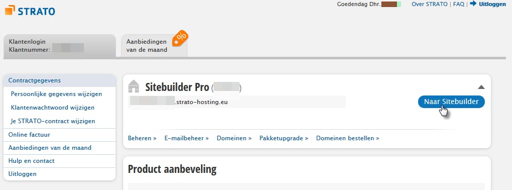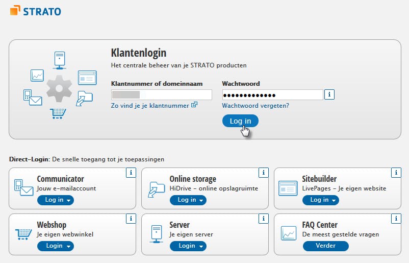 De Sitebuilder helpt je snel naar een strak ogende site. Na aanschaf van een sitebuilderpakket ga je naar https://www.STRATO.nl/apps/CustomerService om in te loggen met het verstrekte klantnummer en bijbehorende wachtwoord. Eenmaal ingelogd klik je op de knop Naar Sitebuilder.
