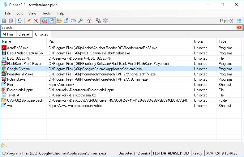 Iedere database vul je met pins via de knop met het pinnetje. Zo’n pin heeft een fiche die verwijst naar een bestand, een map of een snelkoppeling. De knop Path in deze fiche gebruik je om naar de bestanden en applicaties te navigeren waarvan je het pad wilt vastleggen. Je kunt ook gewoon internetadressen in het Path-vakje plakken. Wil je dat een gepind bestand altijd in een bepaald programma wordt geopend, dan koppel je met de knop Open with de gewenste applicatie aan dit bestand. Dat is bijvoorbeeld interessant om een bepaalde webservice altijd te starten in Chrome, terwijl je voor het surfen meestal een andere standaardbrowser gebruikt. De eigenschappen van een pin kun je wijzigen. Klik er met de rechtermuisknop op en kies Edit pin of druk op F2.