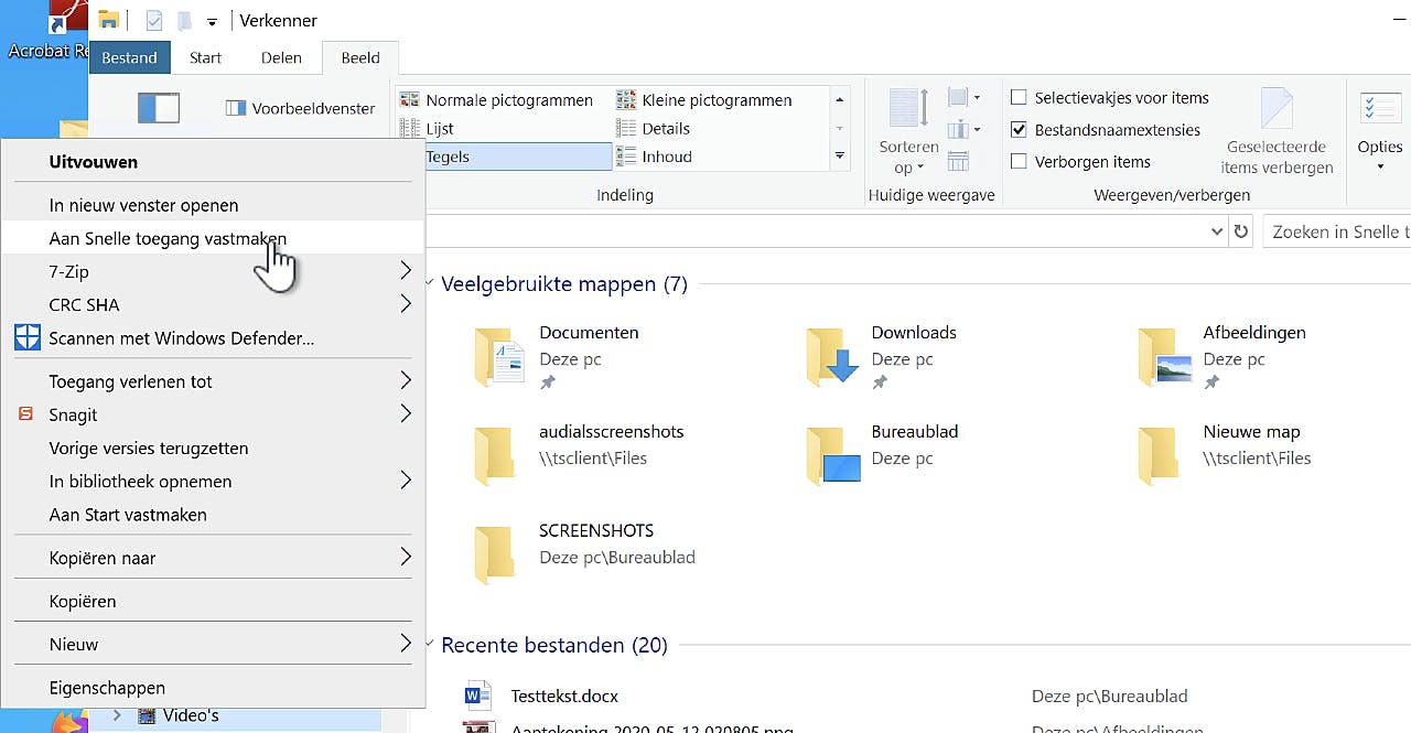 Komt dat maar een heel enkele keer voor en vind je de lijst verder best handig, dan kun je een ongewenste map of bestand uit het lijstje verwijderen door er simpelweg met de rechter muisknop op te klikken en dan in het geopende contextmenu op Uit Snelle toegang verwijderen te klikken. Op dezelfde manier zijn ook de áltijd zichtbare – vastgepinde – mappen in Snelle toegang te verwijderen (alleen klik je dan op Van Snelle toegang losmaken). Om juist een map toe te voegen aan Snelle toegang, blader je met de Verkenner naar de gewenste map. Klik daar dan met de rechtermuisknop op, en vervolgens in het geopende contextmenu op Aan Snelle toegang vastmaken.