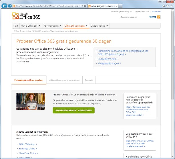 Onlangs introduceerde Microsoft online diensten onder de noemer Office 365. Met Office 365 sluit u een abonnement af voor een deel van de Office-functies. Office 365 wordt geleverd in verschillende abonnementen. De basisprijs is 5,25 euro per maand. In de praktijk is dit het meest geschikte abonnement voor professionele (thuis)gebruikers. Hiermee hebt u toegang tot e-mail, documenten, contactpersonen en uw agenda. Office 365 is een combinatie tussen een online dienst (ofwel clouddienst) en lokale software. U kunt de dienst koppelen aan uw eigen Office-pakket (waarover u in stap 4 en 5 meer leest). Hiermee proberen de makers het beste van beide werelden te combineren: de relatief rijke functionaliteit van lokale programma's met de flexibiliteit van een online dienst.