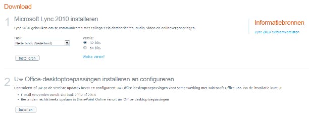 Een ander voordeel is de koppeling tussen de lokale Office-programma's en SharePoint Online. Dit betekent dat u bijvoorbeeld in Word of PowerPoint eenvoudig een document op SharePoint Online kunt u opslaan en het zo voor buitenaf toegankelijk maakt. Op de startpagina klikt u op Download (in de sectie Informatiebronnen). Kies vervolgens of u Microsoft Lync 2010 wilt installeren en de Office-desktopprogramma's wilt configureren. De systeemeisen spelen hierbij uiteraard een belangrijke rol. Voor Office 365 hebt u minimaal Office 2007, Internet Explorer 7 en Windows XP SP3 nodig.