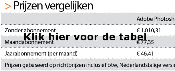 In de tabel hierboven vindt u een overzicht van prijzen die u betaalt wanneer u Adobe-software koopt of juist huurt.