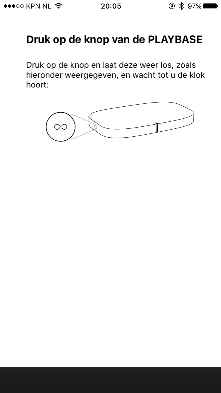 Het gebrek aan aansluitingen zou de Playbase kunnen limiteren, maar het versoepelt ook het installatieproces. Nadat je de Playbase hebt voorzien van stroom, herkent de Sonos-app na een druk op de knop meteen de Playbase. De app begeleidt je verder door een installatie die niet alleen heel eenvoudig was, maar ook nog eens vlekkeloos verliep. Dat laatste is bij veel producten nog maar de vraag.