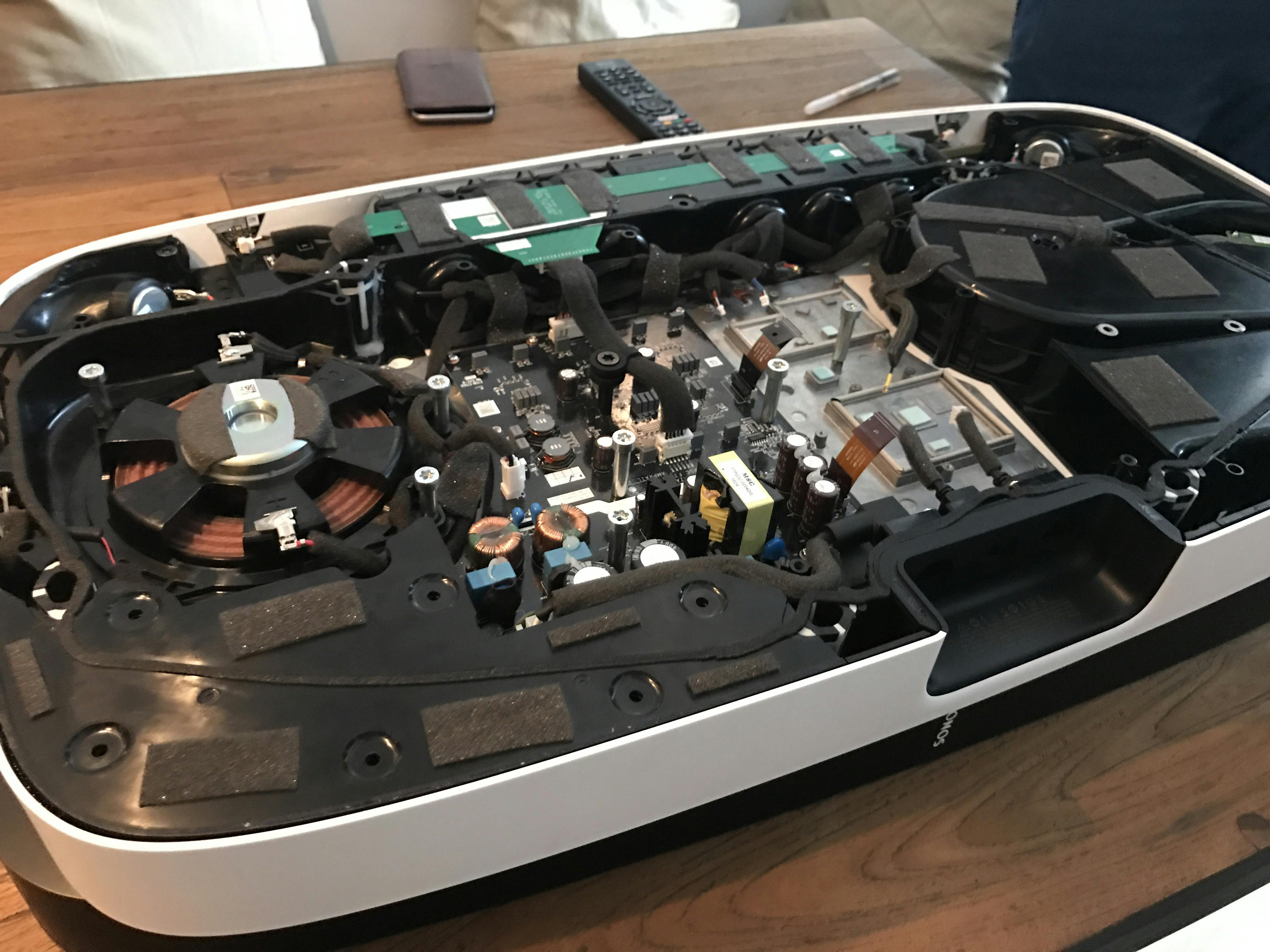Sonos heeft er veel moeite in gestoken om een geïntegreerde subwoofer in de Playbase te stoppen. Deze moest plat genoeg zijn om in de behuizing te passen, zonder dat dit ten koste ging van het vermogen van de subwoofer