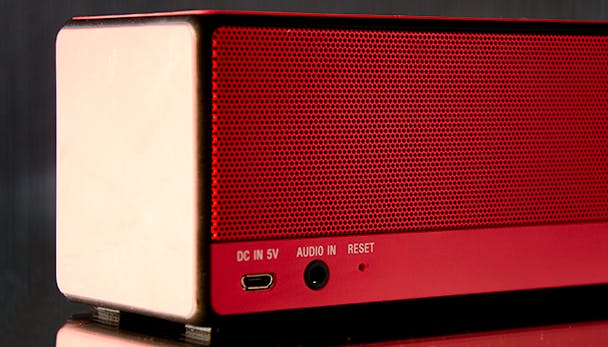 Op de speaker vind je een aantal knoppen. Zo heb je uiteraard de volumeknoppen en de aan-/uitschakelaar, maar ook een knop om telefoongesprekken te voeren, bluetooth-apparaten te koppelen, af te spelen via een aux-kabel en de "Sound"-knop. Deze laatstgenoemde zou een surround geluid moeten creëren. Achterop vind je nog een micro-usb ingang voor de oplader en de aux-ingang. Ook zie je een reset-knopje. De speaker is te verkrijgen in drie kleuren: zwart, wit en rood.