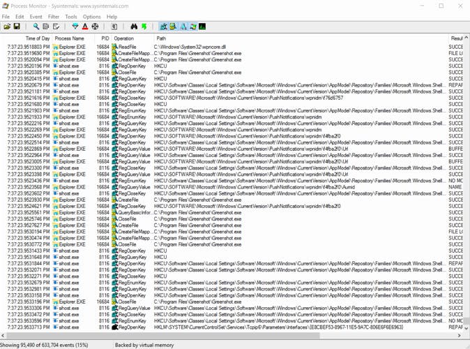 Er komen continu nieuwe gebeurtenissen binnen die Process Monitor vastlegt, dus de lijst wordt alsmaar langer. Standaard zie je de volgende kolommen in Process Monitor: Time, Process Name, PID, Operation, Path, Result en Detail. Time is de tijd waarop het event plaatsvond; Process Name is het verantwoordelijke proces; Operation is wat voor actie er plaatsvond, Path is het bestandspad waarop het event betrekking had. De kolom Result geeft aan of een actie is gelukt, en kan onder andere de aanduiding SUCCESS, NAME NOT FOUND of ACCESS DENIED bevatten. In Detail staat verder gedetailleerdere informatie. Wat handig is bij een event, is om er met de rechtermuisknop op te klikken en te kiezen voor Jump To. Het Path wordt dan geopend, dat kan registersleutel zijn of een map of bestand.