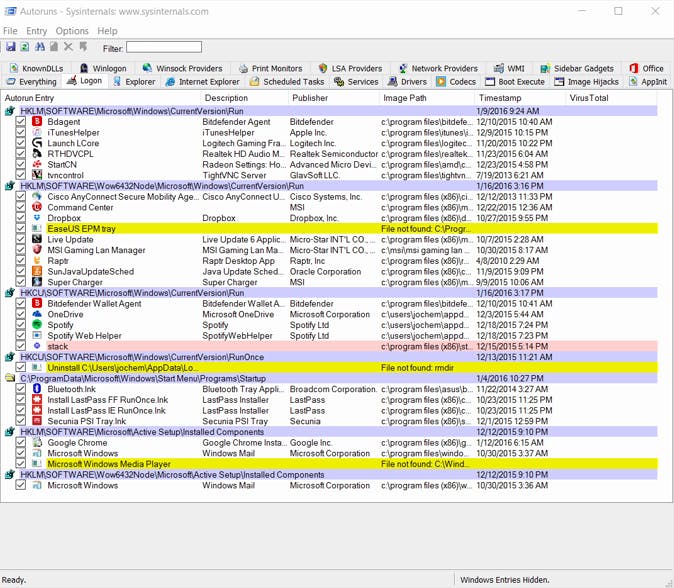 Bovenin Autoruns kun je overigens filteren per item, bijvoorbeeld op loginitems (Logon), geplande taken (Scheduled Tasks). Op het tabblad Internet Explorer zie je alle IE-invoegtoepassingen. Met een vinkje schakel je het een en ander uit. Het beste vink je alles uit, voor een optimale browserervaring. Eventuele malware herken je aan een mogelijke combinatie van dingen: dat de invoegtoepassing niet digitaal ondertekend is, er geen Publisher is, dat de invoegtoepassing zich vaak bevindt bij het Logon-tabblad. Verder bevindt malware bevindt zich vaak in C:\Windows of C:\Windows\System32 en heeft het een naam die nergens op slaat met een willekeurig pictogram. Zie je zo'n proces, scan het dan even met VirusTotal (op dezelfde manier als bij Process Explorer) en schakel het uit. Een andere handigheid is om wijzigingen bij te houden van opstartitems.