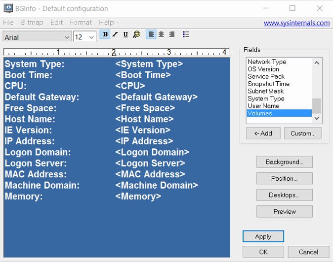 Als je nu op Apply klikt in BGInfo verschijnt direct veel pc-informatie op de achtergrond, zoals de hoeveelheid vrije ruimte, de opstarttijd, de cpu, het geïnstalleerd geheugen, het IP-adres en meer. Je kunt het geheel configureren door in het grote tekstvak te typen en de tekst aan te passen. Variabelen zijn aangegeven met de haakjes: . Je kunt informatie weghalen door het gewoon in het tekstvak weg te halen. Als je weer iets wilt toevoegen, selecteer je die bij Fields en klik je op Add. Bij Position kun je instellen waar BgInfo wordt weergeven en bij Background kun je kiezen wat er moet gebeuren met je bureaubladachtergrond. Standaard wordt die gewoon behouden en wordt de systeeminformatie er transparant overheen gelegd. Je kunt op Use these settings klikken om deze aan te passen.