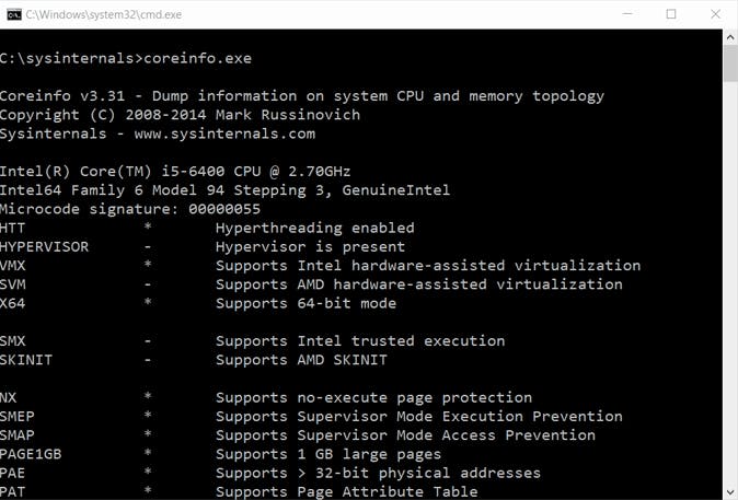 Om snel informatie te verkrijgen over de pc, is Coreinfo handig. Je opent Coreinfo door met de rechtermuisknop in de map C:\sysinternals te klikken met shift ingedrukt. Kies dan voor Opdrachtpromptvenster hier openen. Typ vervolgens Coreinfo.exe en druk op Enter. Je ziet nu bijvoorbeeld of er een hypervisor is of de processor 64 bit is en je ziet de overige instructies die je cpu ondersteunt.