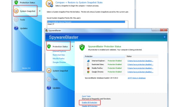 SpywareBlaster kan deze ellende niet oplossen, maar wel voorkomen. Hiervoor gebruikt het programma een aantal effectieve manieren waarvan een momentopname het beste werkt. SpywareBlaster ondersteunt alle bekende browsers waaronder Internet Explorer, Firefox en Google Chrome.