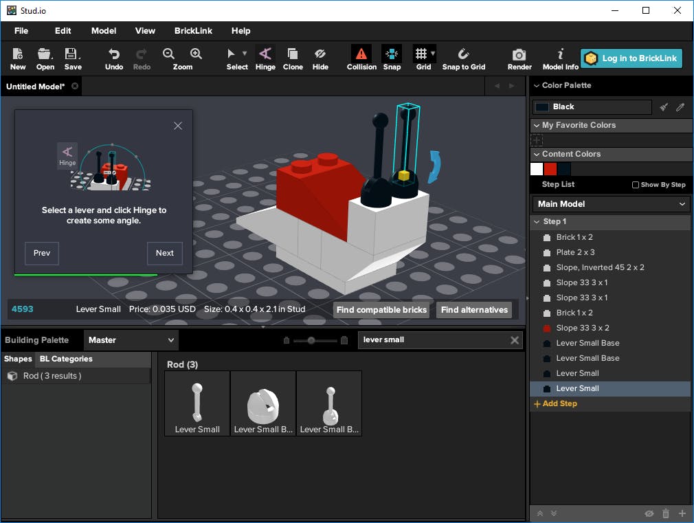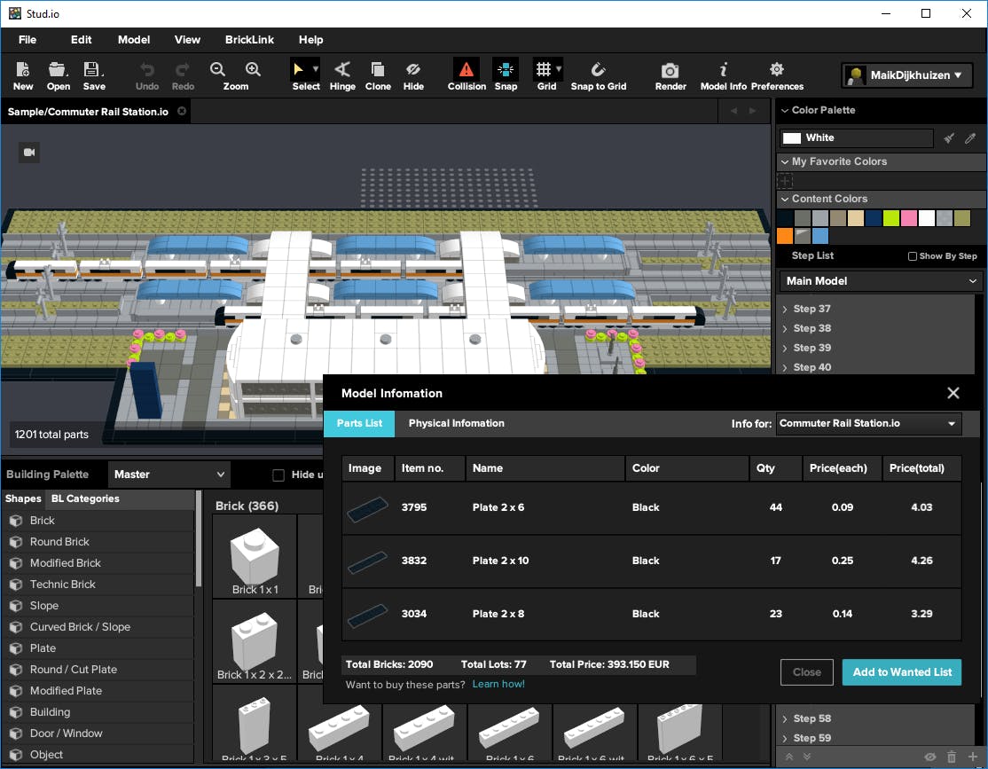 Als je klaar bent met bouwen, vraag je via de knop Model info interessante gegevens over het legoproject op. Zo zie je wat de onderdelen kosten wanneer je alles fysiek zou aanschaffen en je bestudeert de exacte afmetingen. Handig is dat je deze onderdelen direct op een wensenlijstje plaatst, waarna je de boel daadwerkelijk kunt bestellen. Hiervoor is wel een BrickLink-account vereist. Je wordt automatisch aan de juiste winkels gekoppeld en plaatst eventueel direct een bestelling. Zeker bij geavanceerde bouwprojecten moet je de onderdelen doorgaans bij verschillende adressen reserveren.