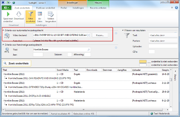 Geef bij Video bestand het bestand op waarvoor u de ondertiteling zoekt en kies bij Taal voor Dutch (en/of een andere taal). In principe heeft Sublight nu voldoende informatie om de ondertiteling te vinden. De film wordt automatisch uit de bestandsnaam gefilterd. Als de zoekresultaten niet bevallen, kunt u zelf een zoekterm opgeven bij Criteria voor handmatige zoekopdracht. Hoewel de bovenstaande handelingen veel eenvoudiger zijn dan het afstruinen van allerlei websites, komt nu pas de kracht van Sublight aan het licht: dubbelklik op een van de zoekresultaten en Sublight plaatst het bestand met ondertiteling zelf in de juiste map. Het past bovendien zelfstandig de bestandsnaam aan, zodat deze overeenkomt met uw film. Vervolgens wordt de film gestart en kunt u direct zien of de gevonden ondertiteling correct werkt. Voor sommige databases waar sublight in zoekt, bijvoorbeeld die van Podnapisi.net, is (gratis) registratie vereist.
