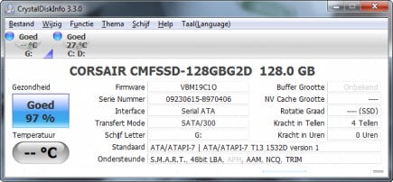 Deze Transcend is een oude bekende. Net als in onze vorige test vliegt hij lekker mee met de rest. De prestaties liggen dicht tegen die van de A-DATA aan. Niet verwonderlijk, aangezien het om dezelfde hardware gaat. Ook Transcend gebruikt Samsung-geheugen met een Indilinx Barefoot-controller en 64 MB Elpida cachegeheugen. Het cachegeheugen dient als buffer om de informatiestroom op gang te houden, tevens is dit geheugen nodig voor het wissen van gegevens met behulp van TRIM. Ten opzichte van onze vorige test is nieuwe firmware beschikbaar gekomen. Deze updates zijn voor u als mogelijk SSD-gebruiker van belang omdat dit de SSD compatibel kan maken met nieuwe technieken of sommige toepassingen een snelheidsinjectie geeft. Ten tijde van onze eerste test ondersteunde de Transcend SSD25D nog geen TRIM. Dankzij de nieuwe firmware is dat nu wel het geval. We kunnen dit controleren met behulp van het programma CrystalDiskInfo, dat de firmwareversie uitleest, de ondersteunende functies laat zien en de gezondheid van de SSD weergeeft. Windows 7 activeert TRIM standaard wanneer het besturingssysteem een SSD detecteert. Voorwaarde is wel dat u gebruikmaakt van de Microsoft-driver voor de SATA-controller. Gebruikt u een driver van een andere leverancier (in geval van een RAID-configuratie bijvoorbeeld), vraag dit dan na bij de leverancier.
