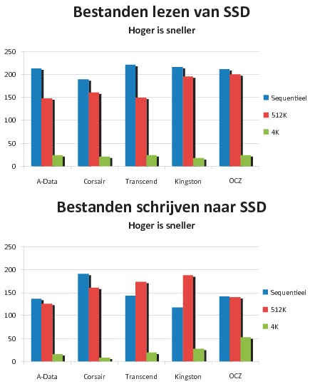 Alle geteste SSD’s ondersteunen TRIM onder Windows 7 en zijn dan ook in staat om de schrijfprestaties ook na verloop van tijd op peil te houden. De OCZ Vertex 2 Pro behoort tot de nieuwste generatie SSD’s. De processor van de SandForce-controller beschikt over ‘embedded’ (oftewel ingebakken) geheugen, waardoor de OCZ Vertex zeer efficiënt en snel werkt. Extern cachegeheugen is niet meer direct nodig. Omdat deze technologie nieuw is, zal het optimaliseren nog enkele maanden in beslag nemen. Wanneer de, nu nog onbekende, prijs van de OCZ Vertex 2 Pro dichtbij de Kingston SNVP325-S2B/128GB komt te liggen, is de OCZ een aanrader. Belangrijk voor SSD is de leessnelheid, u zult deze namelijk vooral voor Windows en uw applicaties gebruiken. De Kingston SNVP325-S2B/128GB scoort over alle linies als beste. Bent u prijsbewust, dan is het beter om te kiezen voor de Corsair P128. De verschillen in prestaties zult u in uw Windows-omgeving niet opmerken, maar u bespaart wel 50 euro.