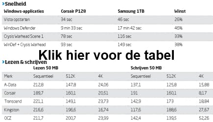 Voordat we daadwerkelijk met onze test begonnen, hebben we eerst alle SSD’s naar nieuwstatus gebracht met behulp van Active@ KillDisk. In de workshop ‘Overstappen op SSD’ (zie pagina 40), leggen we uit hoe u dit kunt doen met een bootable usb-stick. Het schoonmaken van een SSD met KillDisk is eveneens aan te raden wanneer u beschikt over een al gebruikte SSD en Windows 7 opnieuw wilt installeren. Bij een SSD van 120 GB neemt dit proces ongeveer 30 minuten in beslag. Om de schijven onderling met elkaar te vergelijken, voeren we een schrijf- en leestest uit, waarbij we bestanden van verschillende omvang gebruiken. Hoe nuttig deze cijfers ook zijn, het blijft lastig om te bepalen welke impact een SSD voor u kan hebben wanneer u die installeert ter vervanging van een ¬reguliere harde schijf. Om u een idee te geven, hebben we enkele tests gedaan met de Corsair P128. Dit vergelijken we met de prestaties van een reguliere harde schijf. Omdat het hierbij niet mogelijk is om met tienden van seconden te werken, zijn de ¬resultaten naar boven afgerond op hele seconden. De scores gelden natuurlijk ook voor de functies die binnen een applicatie worden aangeroepen. Flinke prestatiewinsten zijn te noteren voor alle denkbare applicaties, maar ook voor een complete systeemscan met Windows Defender. Hier rondt de Corsair P128 de scan af in 9 minuten en 33 seconden - bijna twee keer zo snel als de Samsung Spinpoint F3 7200rpm. De Samsung is niet bepaald langzaam, maar wordt weggevaagd door de Corsair P128.