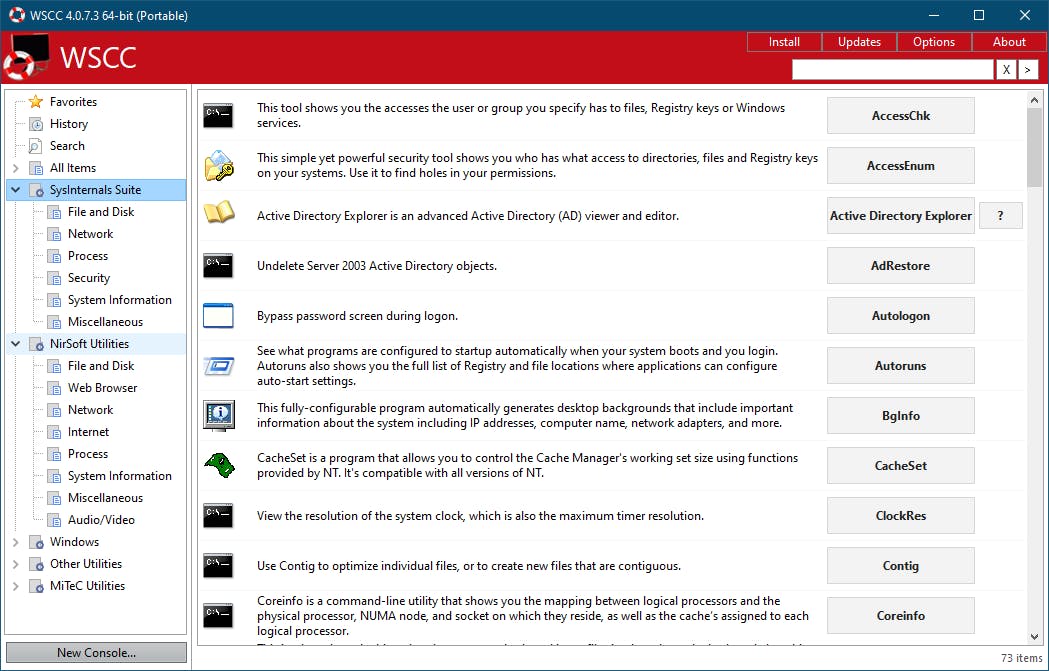 Werk je graag met tools uit zowel de NirLauncher-suite (NirSoft Utilities) als de Sysinternals Suite, dan kun je beide afzonderlijk downloaden, maar handiger is dan het gebruik van Windows System Control Center (WSCC). Deze overzichtelijke grafische interface combineert namelijk beide suites en voegt er zelfs nog enkele andere tools aan toe. Je kunt kiezen uit 32- en 64bit-versies, en een portable versie of een installatiebestand. Wij gaan uit van de portable versie.
