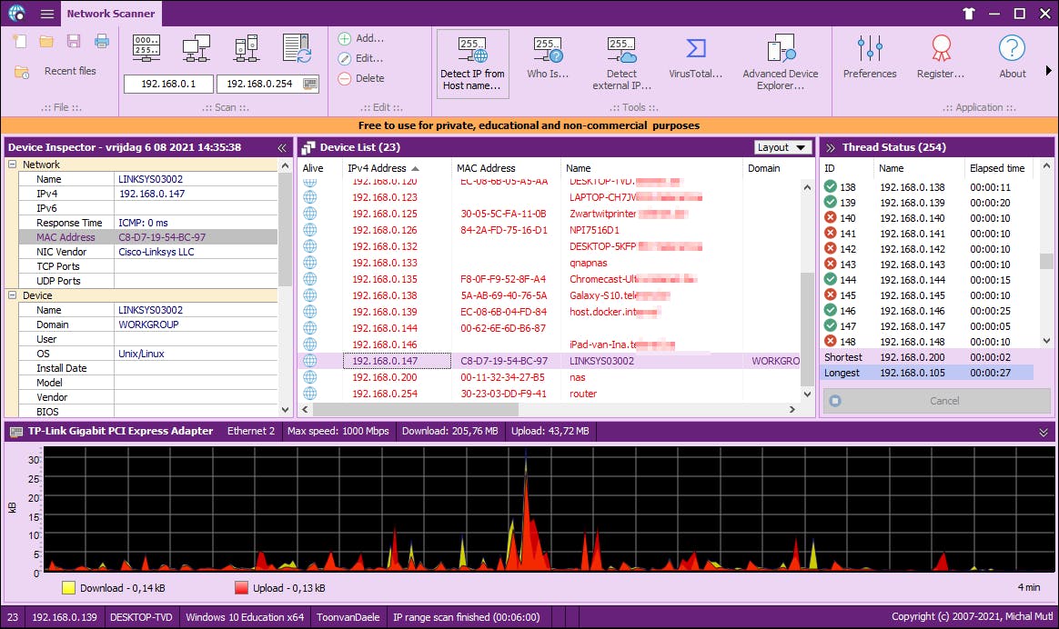 Om een overzicht te krijgen van je actieve netwerkapparaten hoef je maar het lokale ip-bereik in te vullen en de knop IP Range Scan in te drukken. Je versnelt het scanproces enigszins door bij Preferences het aantal threads te verhogen.