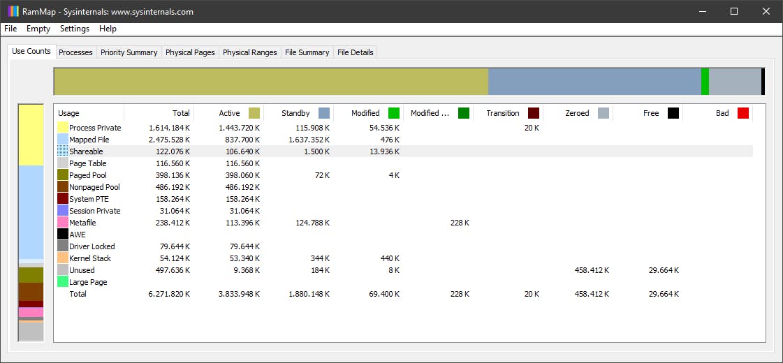 Met HEX Editor kun je weliswaar ook geheugengebieden benaderen, maar wil je specifiek het geheugengebruik van processen of applicaties nagaan, gebruik dan liever de tool RAMMap. Een deel van deze informatie vind je ook in het Windows Taakbeheer (via Prestaties / Broncontrole openen / Geheugen), maar RAMMap gaat duidelijk grondiger te werk.