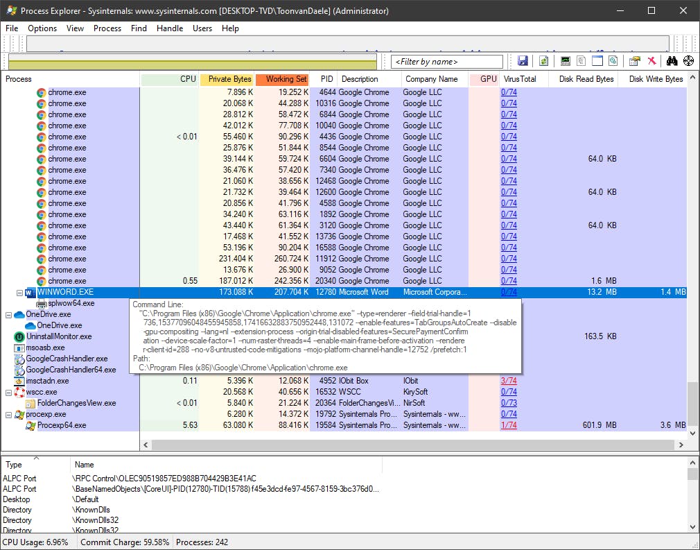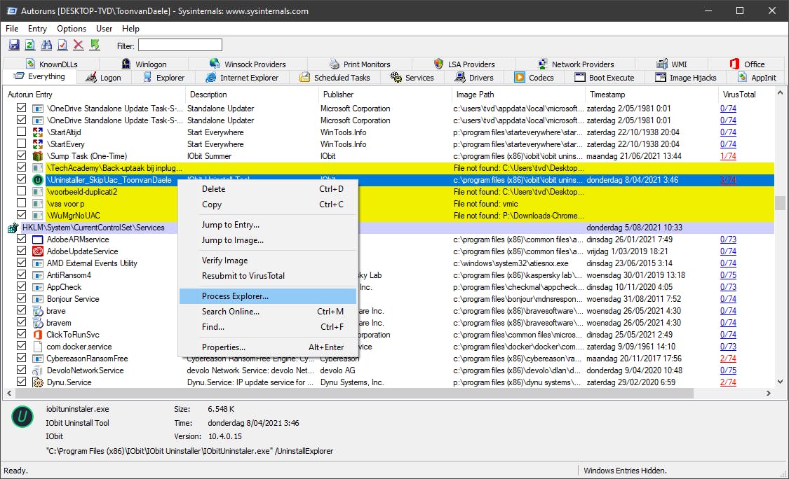In de kolom VirusTotal staan ook de analyseresultaten van de bekende online virusscanner VirusTotal. Een score van bijvoorbeeld 3/74 geeft aan de 3 van de 74 virusscanners een potentiële bedreiging heeft vastgesteld. Vanuit het contextmenu ga je meteen naar het bewuste item (in het register), maar kun je ook extra informatie van Process Explorer opvragen.