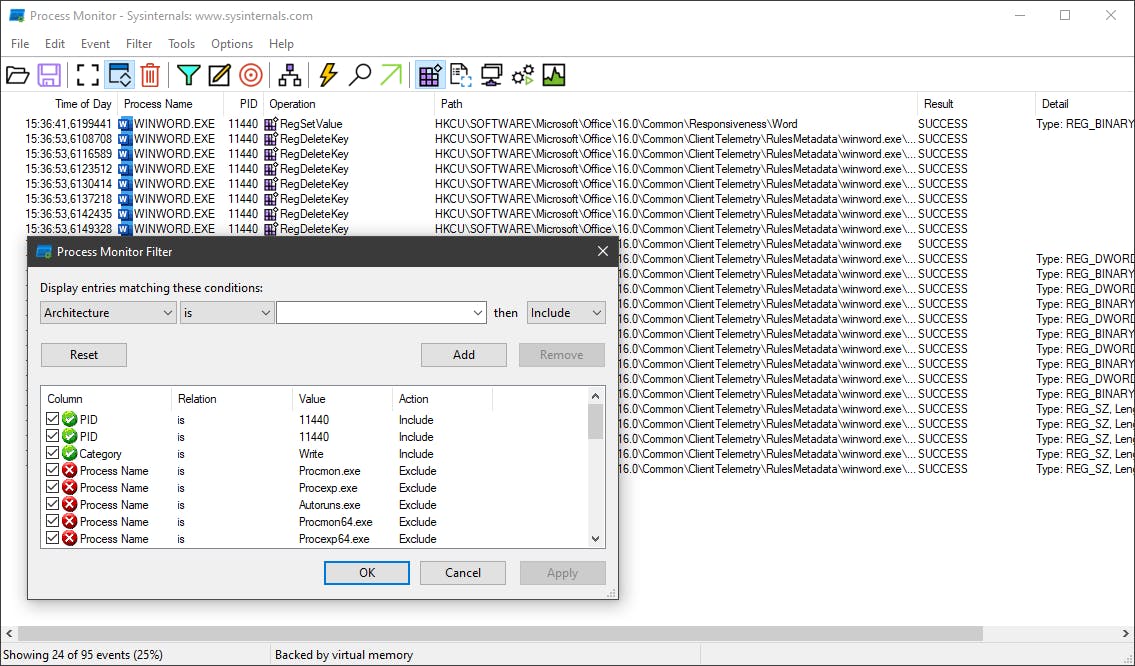 Is het vooral je bedoeling specifieke bestanden en registersleutels of zelfs dll’s en threads te volgen, bijvoorbeeld om na te gaan wat de impact is van een applicatie of proces, dan heb je een tool als Process Monitor nodig. Met de knop Capture (sneltoets Ctrl+E) start en stop je het scanproces, en met de knop Clear ruim je de scanresultaten in één keer op.
