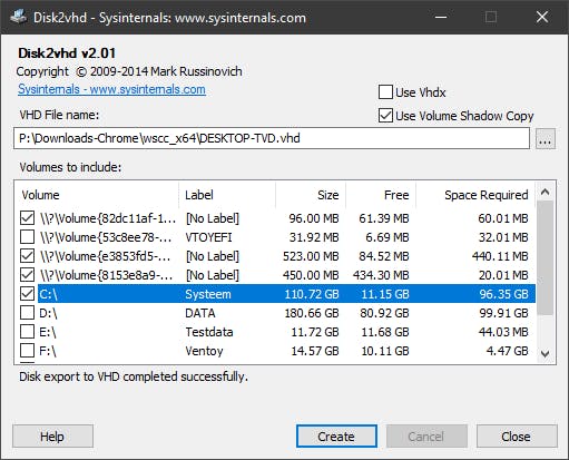 Bij het opstarten maakt de tool een lijst van alle gedetecteerde volumes en je kunt er meerdere tegelijk selecteren. Houd er rekening mee dat er een afzonderlijk vhd-bestand wordt gemaakt voor elke fysieke schijf waarop de geselecteerde volumes zich bevinden. Je laat het best het vinkje staan bij Use Volume Shadow Copy en je verwijdert juist het vinkje bij Use Vhdx . Je start het proces met de knop Create. Besef wel dat deze operatie best lang kan duren.